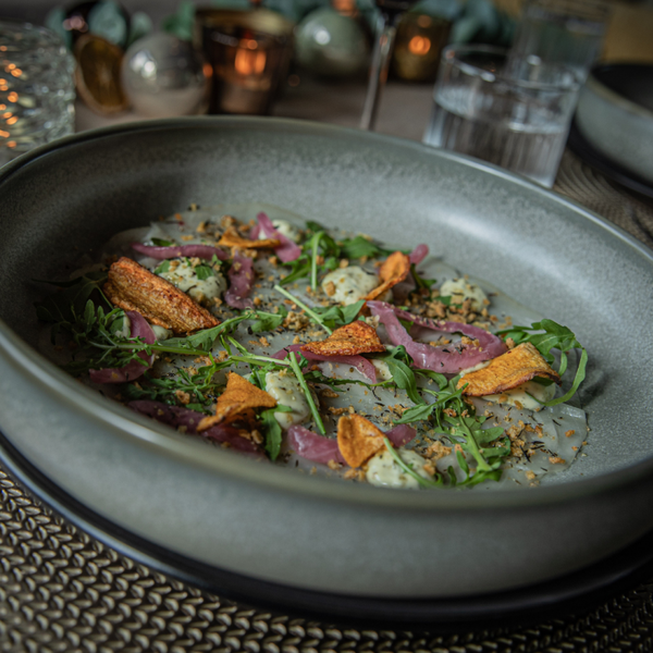 - Boterviscarpaccio met rucola, kruidenmayo, zoetzure rode ui, honing-tijm crumble en groentenchips
