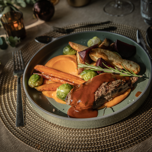 - Diamanthaas, rode wijn jus, geroosterde groenten, groentenpuree en roseval aardappeltjes